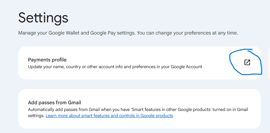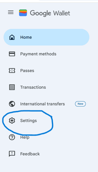 ابتدا سایت https://pay.google.com را حتما با سرویس تغییر آیپی باز کنید در صفحه باز شده سمت چپ در قسمت منو settings را انتخاب کنید.