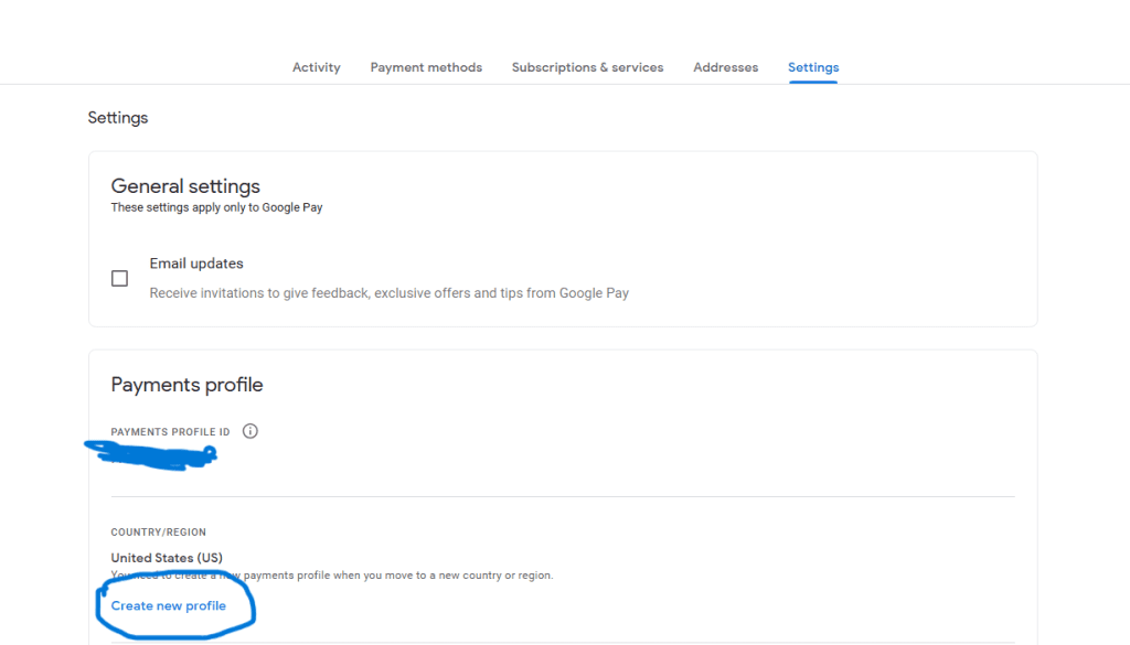 در این صفحه باز شده در قسمت نوار بالا روی گزینه settings کلیک کنید در قسمت payments profile روی edit همان قلموی کنار country بزنید سپس create new profile را انتخاب کنید.