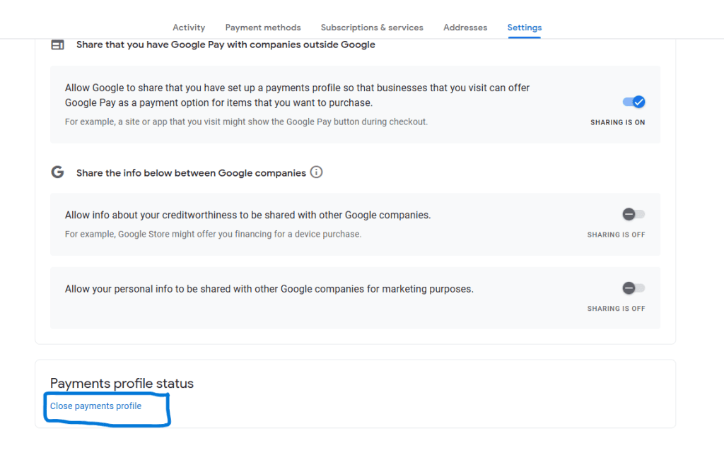 به پایین صفحه روید در قسمت payments profile status گزینه close payments profile انتخاب کنید در صفحه باز شده رمز جیمیل خود را بزنید سپس از شما می پرسد برای چه موردی می خواهید حساب خود را ببندید به عنوان مثال گرینه حساب جدیدی دارم و به این حساب نیاز ندارم را انتخاب کنید و submit را بزنید حالا پروفایل قبلی حذف و پروفایل جدید جایگزین آن شد.